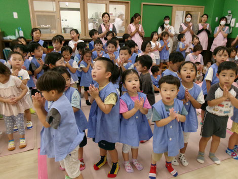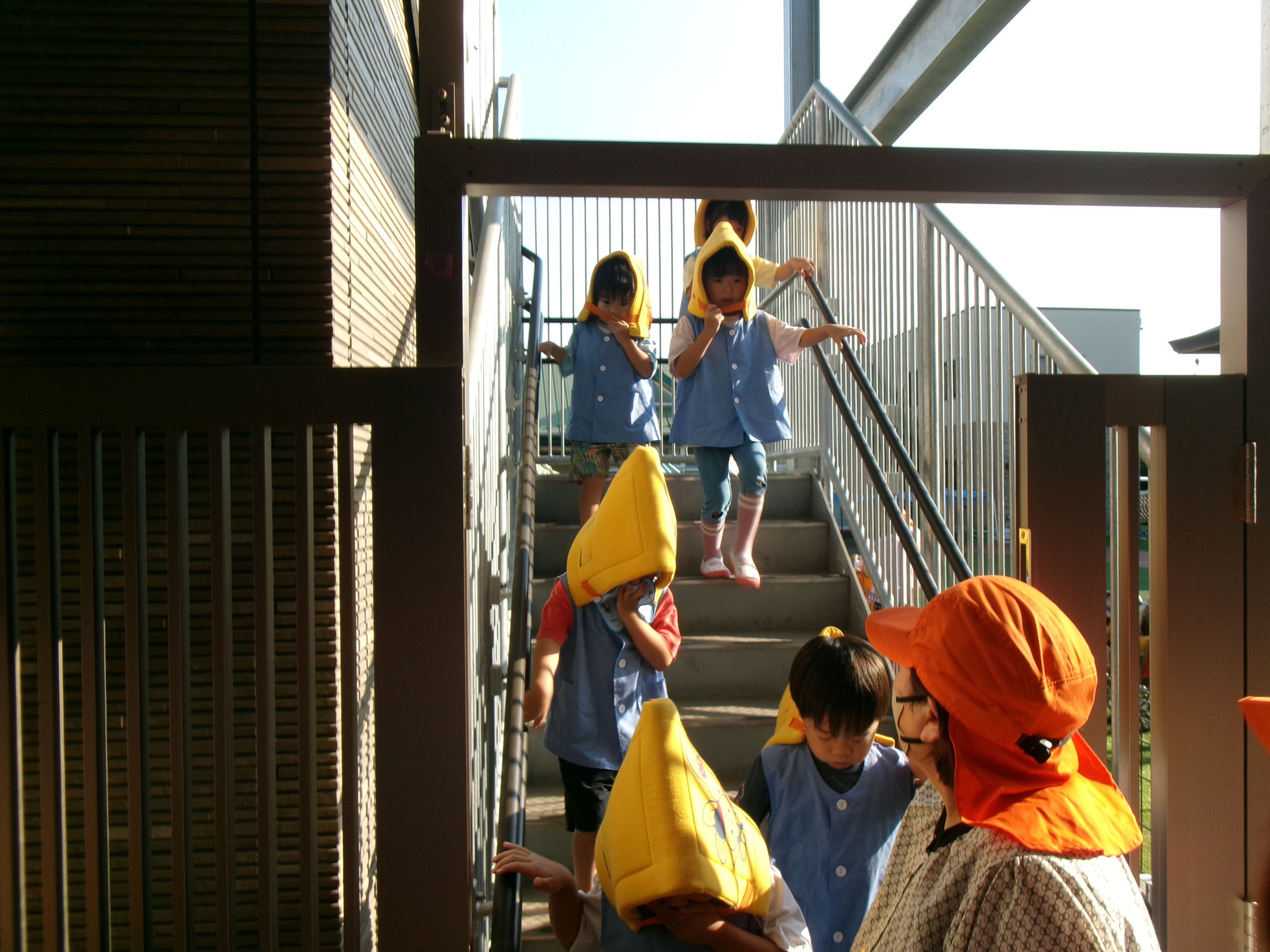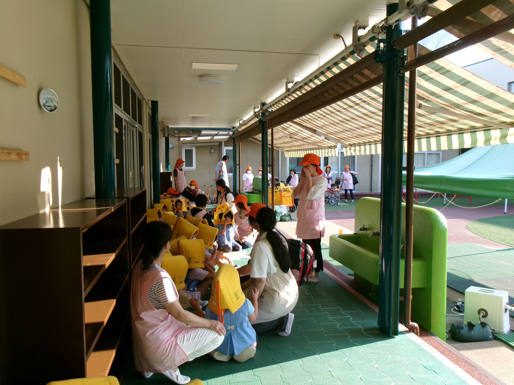 色々な災害用のものに触れたり、食べたりして、夕方16:00からは園児引き渡し訓練を行いました。午前中に取り組んだ、避難の仕方、頭を守る姿勢、「おかしも」を守って素早く避難していた子ども達です。災害はいつ起こるか分かりません。こうした訓練を繰り返し、いざというときに慌てないようにしたいですね。